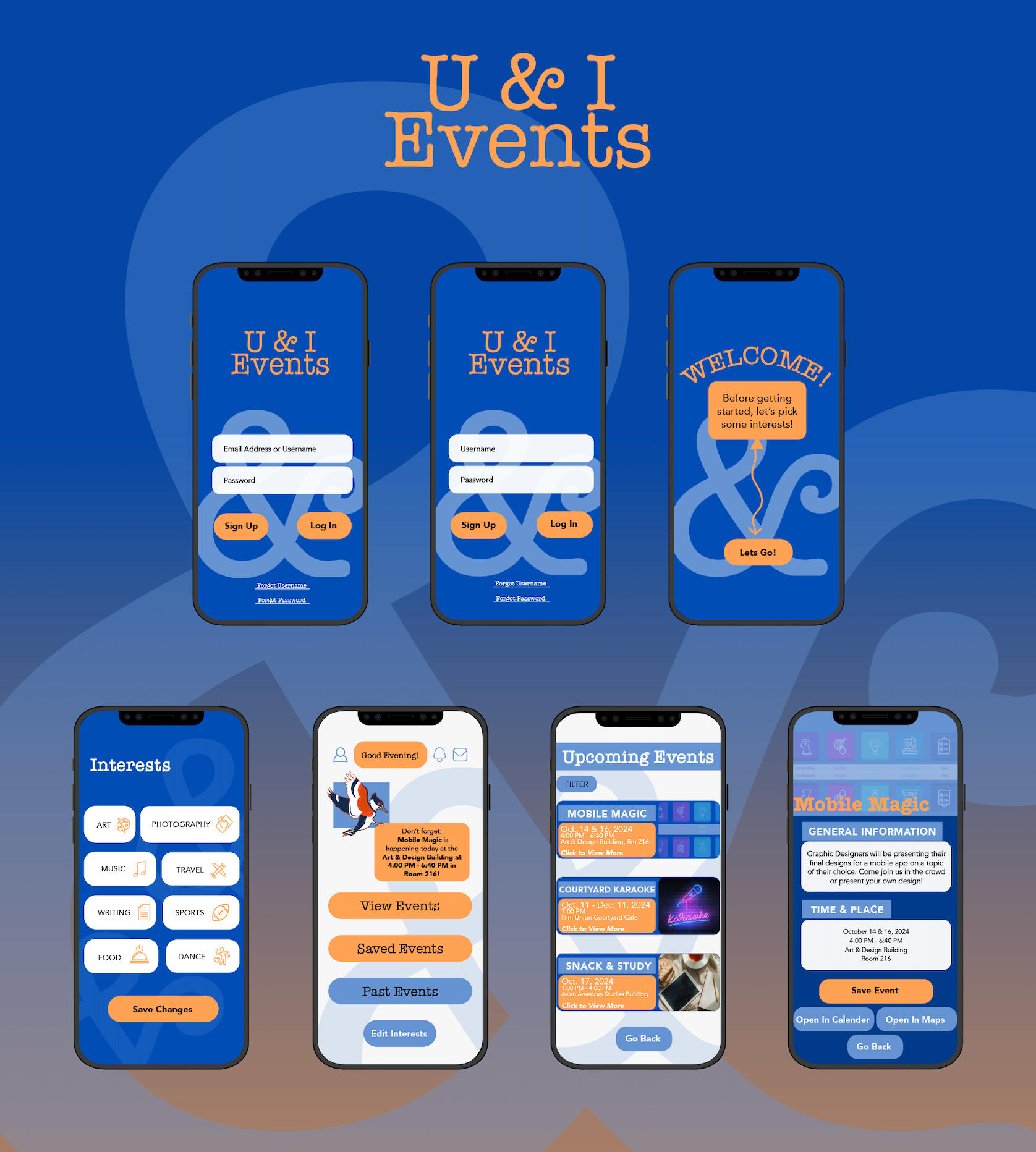 Individual project – I was responsible for research, design, and presentation.This project's briefing was to create an app that solves a problem. The problem I wanted to fix was being able to find details about events happening on and around the UIUC campus. My solution was an app that shows users of upcoming events, allowing them to save events to a list, as well their calendar. Users would then be notified and reminded of the events as they come up.