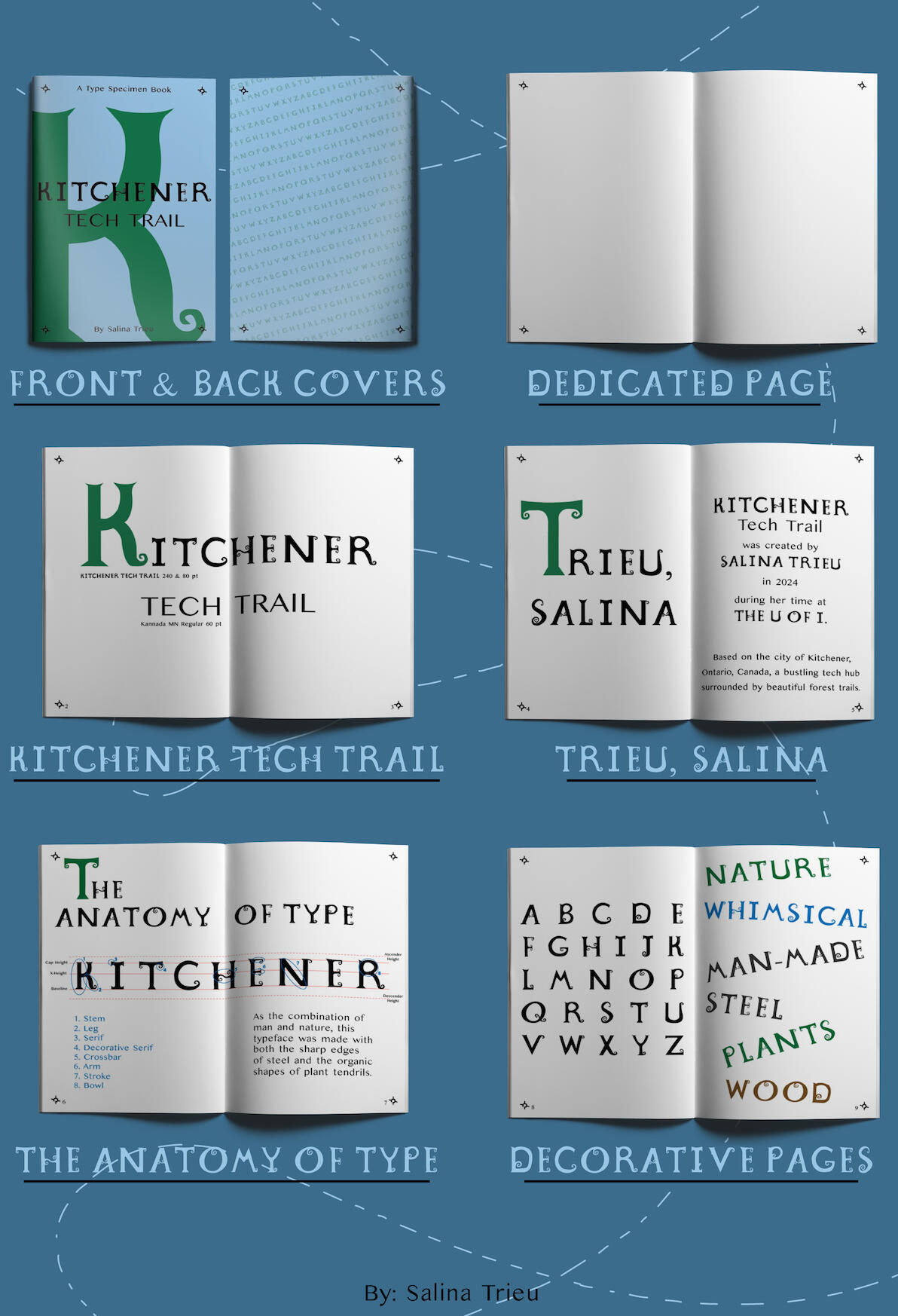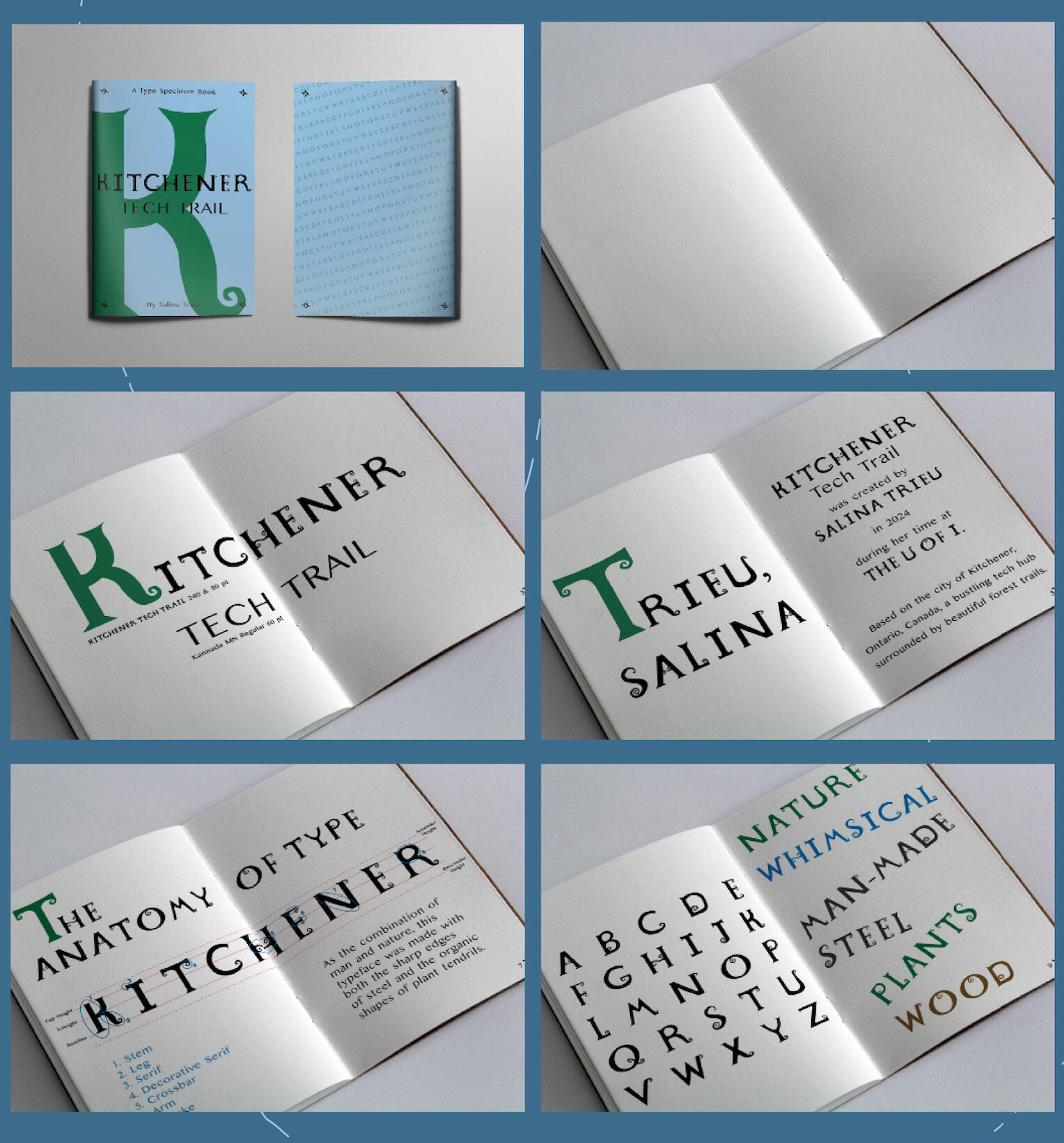 Individual project – I was responsible for research, design, and presentation.In this project I created my own custom typeface based on Kitchener, Ontario, Canada, a bustling tech hub surrounded by beautiful forest trails.Kitchener Tech Trail utilizes a blend of sharp edges and rounded swirls to create a whimsical yet technical feel. The big, bold lettering makes it a great choice for headlines.